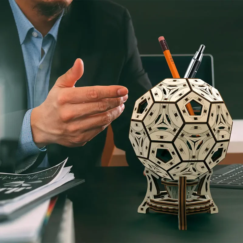 The 3D Wooden Puzzle journey invites you to immerse yourself in the creation of this multifunctional organizer. Crafted from Birch, the model evolves into a sturdy football-shaped unit that doubles as an interactive desk piece and a toy.