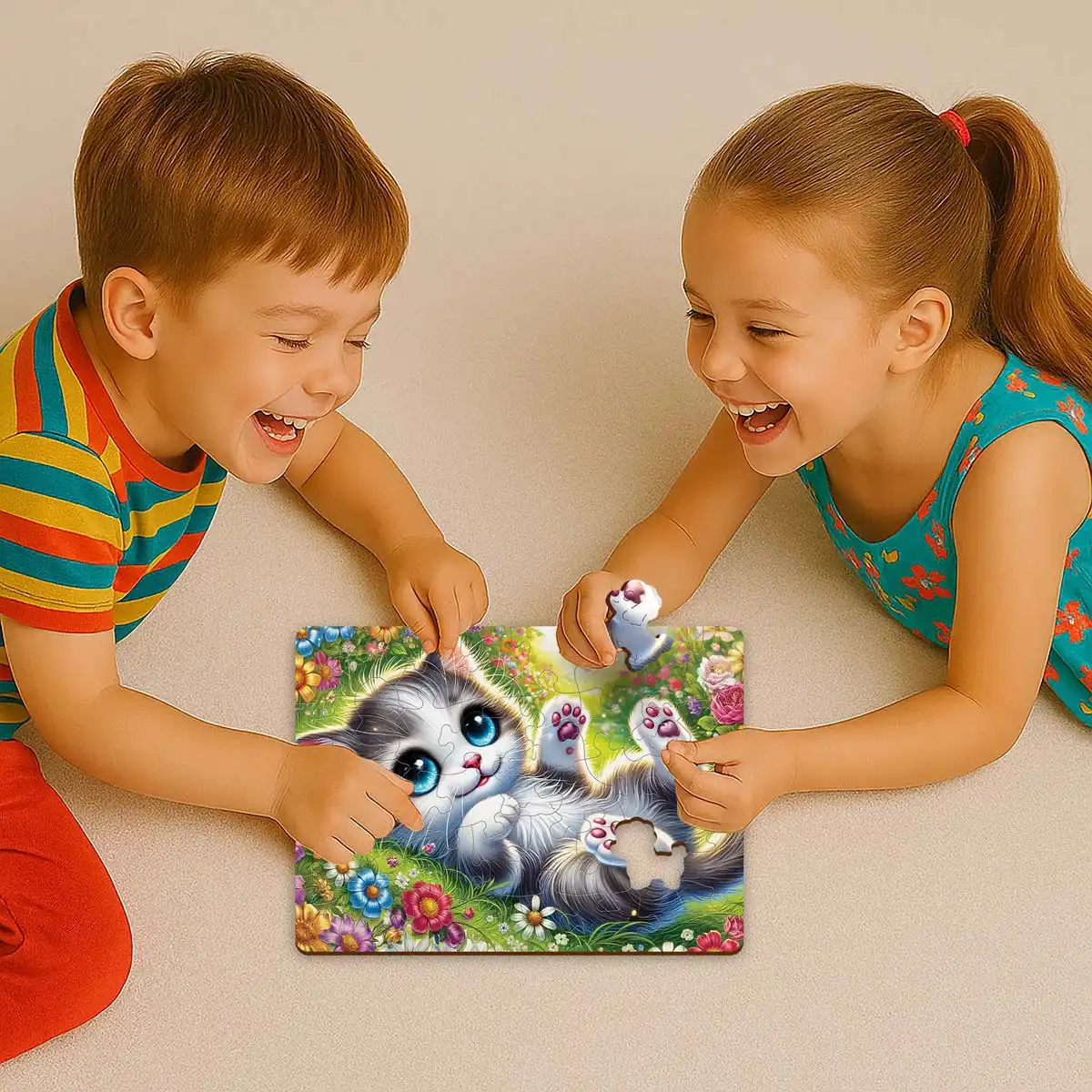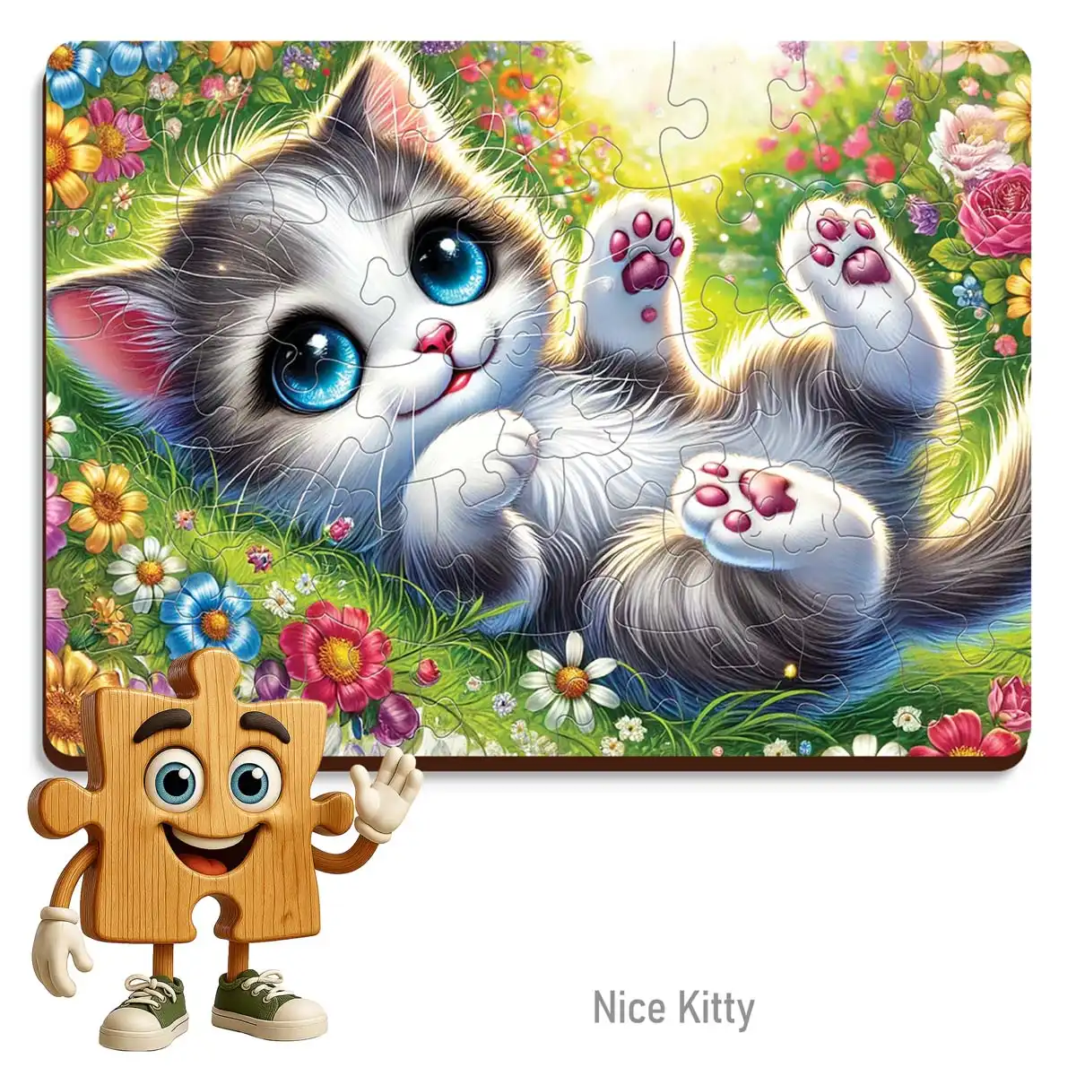 The Wooden Puzzle 40 Nice Kitty tells a gentle story of peace, nature, and the simple happiness found in small moments. Piece by piece, it reveals an adorable kitten surrounded by soft petals and tender light. The little cat stretches lazily, its fur catching glimmers of sunlight, while butterflies dance nearby. The soft tones of pink, yellow, and green create a calm, soothing composition that invites you to slow down and smile.