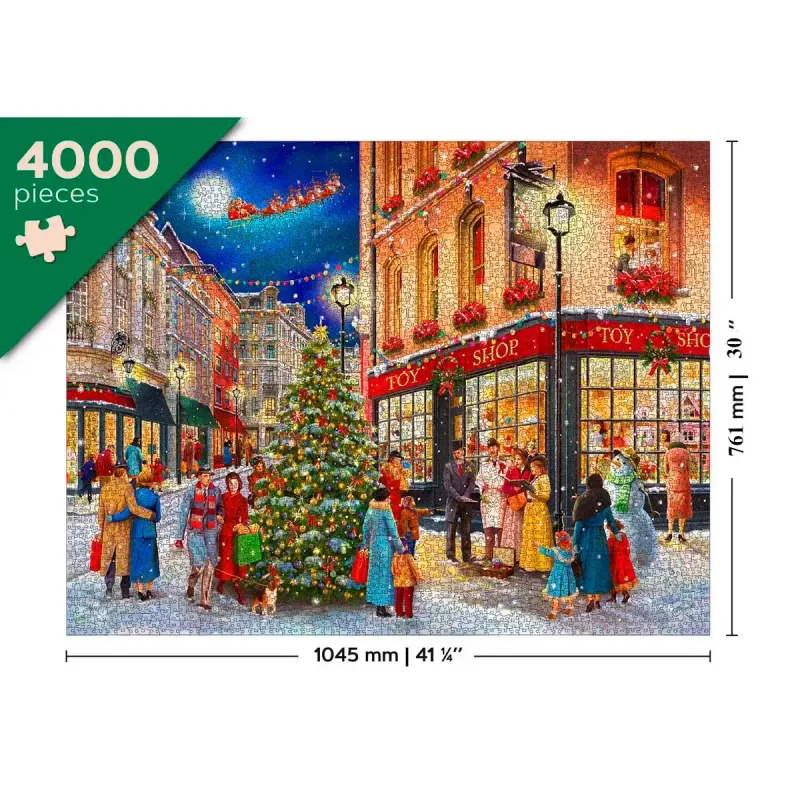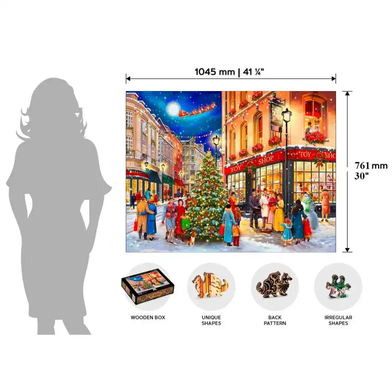 In this special product, the Christmas Street 4000 Wooden Puzzle comes to life through 4000 unique pieces, each carrying its own shape and identity. It beautifully captures a bustling Christmas scene, filled with holiday cheer, where people are purchasing gifts, strolling around a Christmas tree, and enjoying the decorations of wreaths and street garlands. In the sky, Santa Claus and his reindeer are seen rushing to deliver gifts, while a snowman stands by the tree, adding to the festive atmosphere.